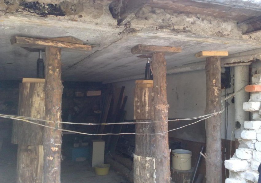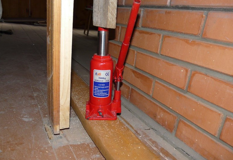 - Домкратом. Это самый трудоёмкий вариант, для выполнения которого понадобится больше времени и более тщательная подготовка крыши. С внутренней стороны устанавливают дополнительные связующие, которые не позволят кровле во время её поднятия перекоситься. Надо будет несколько домкратом, причём их количество должно быть чётным. После поднятия определённого участка кровли, она фиксируется, и переходят к другому участку. Таким образом, можно поднимать не только крыши из бетонных плит, но и деревянную стропильную систему, только её надо правильно укрепить.