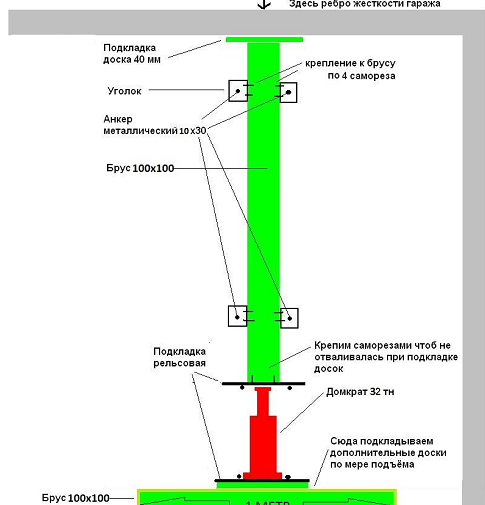 Очень часто гаражи имеют общую стену, в этом случае поднять крышу будет сложнее, чем в отдельно стоящем здании. Это связано с тем, что ширина общей стены обычно не превышает ширины одного кирпича, и для домкрата остаётся мало опорной поверхности.