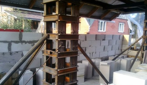 - колонны можно сделать из мощных металлических швеллеров, которые дополнительно обвязываются стальным профилем.