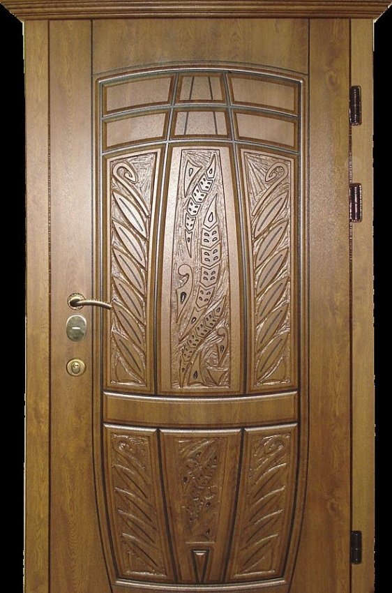- Натуральное дерево. Этот способ позволяет преобразить обычную металлическую дверь и сделать из неё настоящее произведение искусств. Такое полотно украшается резьбой и внешне не отличается от того, что сделано из натурального дерева.