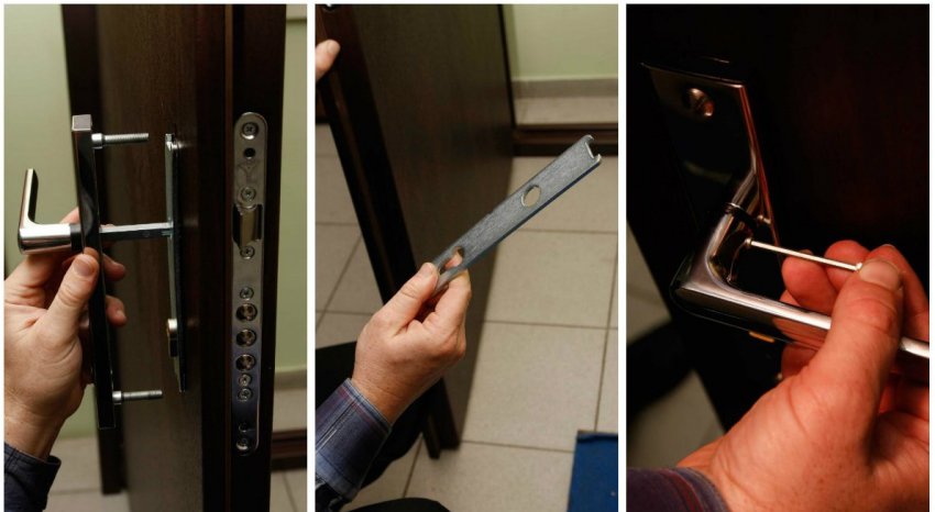Для того чтобы снять нажимную ручку на металлической двери, надо выполнить следующие операции: