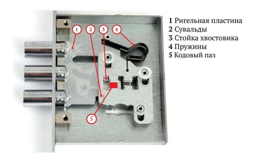 - сувальдные механизмы имеют более сложную конструкцию, но и надёжность у них самая высокая, здесь ключ в виде стержня с зазубринами и вырезами;