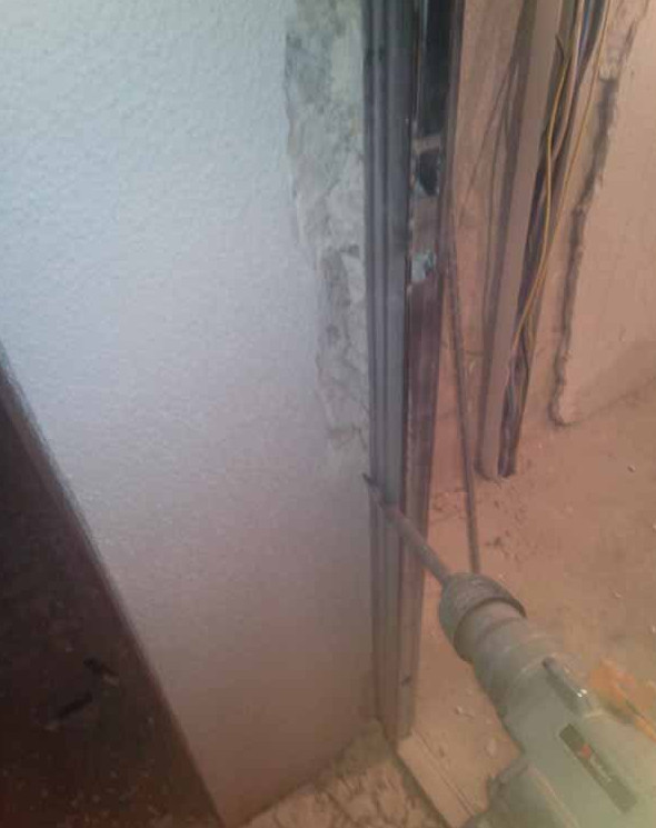 - Освобождение места крепления дверной коробки. Если ушки крепления дверной коробки спрятаны под дверным откосом, то надо отбить штукатурку и найти места креплений. Анкера могут закручиваться через дверную коробку, в таком случае их просто выкручивают. Если фиксация выполнялась при помощи сварки, то надо отрезать крепления с применением болгарки.