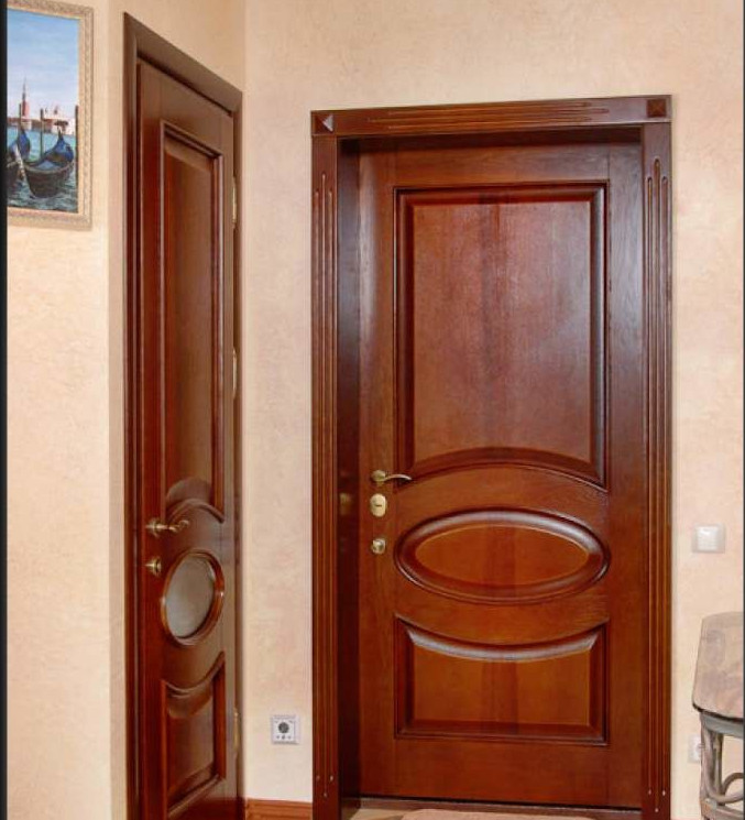 - полотна из натуральной древесины экологичны, солидно выглядят, могут быть любого цвета, но имеют высокую стоимость и недостаточно устойчивы к механическим воздействиям, так как на древесине легко образуются царапины. Поэтому лучше всего устанавливать двери из твёрдых пород: дуба, берёза, ясень, орех. Такие варианты дорогостоящие, что не всегда рентабельно для второй входной двери в квартиру;