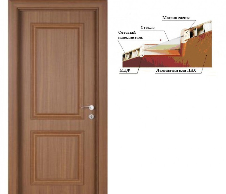 Конструкция оптимального варианта изделия не имеет стеклянных вставок, так как они хрупкие и не повысят звукоизоляцию помещения. Поэтому полотно включает в себя каркас из древесины, филёнки, поперечины, а короб служит для установки. Фурнитура делает дверь функциональной, а представлены комплектующие замком, ручкой, петлями. При этом механизм запирающего устройства может кардинально отличаться от замка первой перегородки. Обусловлено это тем, что злоумышленникам будет гораздо труднее вскрыть разные механизмы.