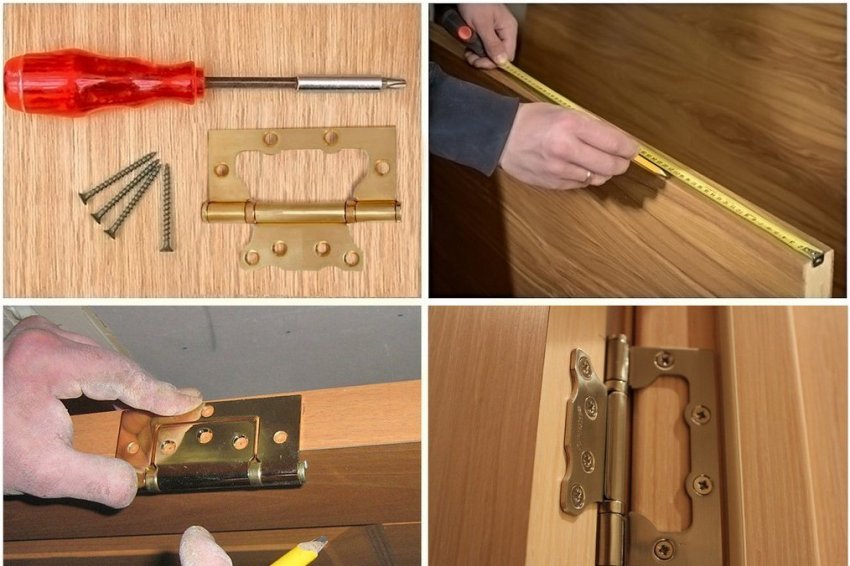 Если их нет, то нужно отметить места для установки петель, а затем при помощи стамески или фрезера нужно сделать углубления 2,2–2,7 мм. После этого устанавливают детали на свои места. Придерживая их рукой, делают отверстия для саморезов и фиксируют петли. Таким же образом устанавливают детали и на дверную коробку.