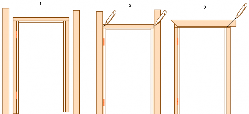 После соединения деталей дверной коробки она устанавливается в проём и фиксируется при помощи саморезов