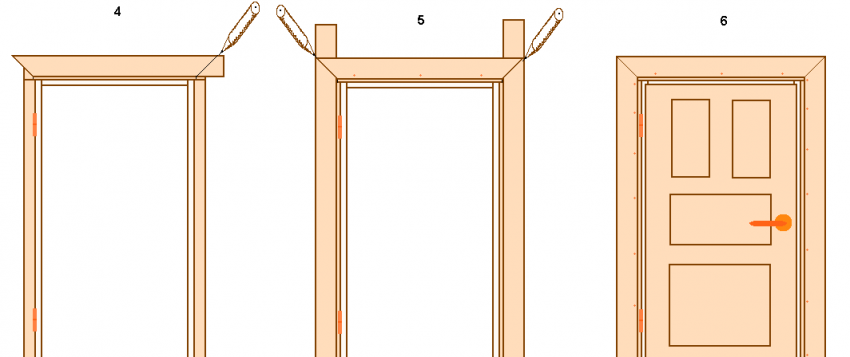 Использование наличников является самым простым вариантом, он удобен, когда ширина стены и дверной коробки одинаковые. В этом случае достаточно прибить или приклеить на короб наличники соответствующих размеров. С их помощью вы скроете зазор между стеной и коробом. Последовательность установки наличников будет следующей:
