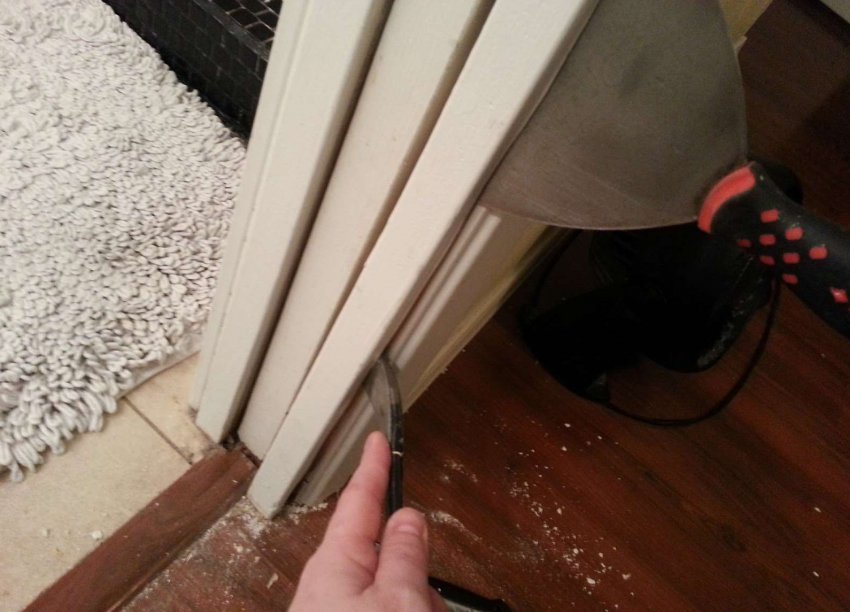 - Снятие наличников. Чаще всего они повторно не используются, поэтому беспокоиться об их сохранности во время монтажа не стоит. Между коробом и наличником устанавливают лезвие топора, после чего забивают молотком, а затем снимают наличник. Топор нужно вставлять в тех местах, где находятся гвозди, крепящие наличник.