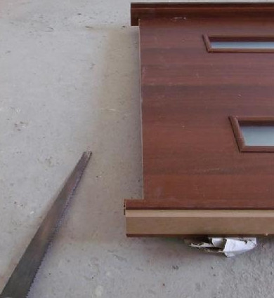 - Отпиливание вертикальных стоек. Их делают с небольшим заводским запасом, поэтому после примерки надо сделать подгонку по размеру двери. Чтобы выполнить работу аккуратно, лучше использовать ручную пилу.