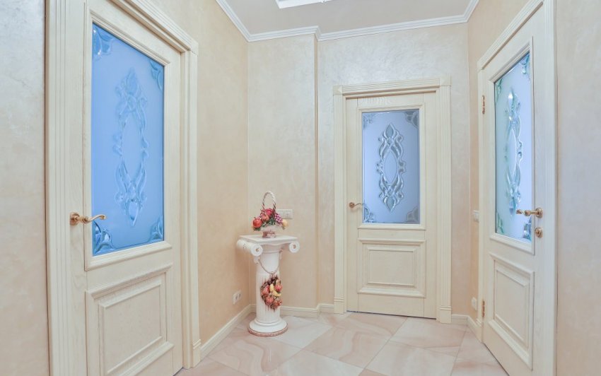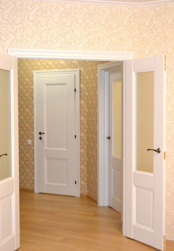 Двери с филёнками сложной формы (арочными, овальными, вычурными) всегда относятся к классике, дворцовому стилю, барокко, рококо, ампиру. Сами по себе они очень красивы, но требуют достойного обрамления — комнат большой площади, анфиладных переходов, мебели с витиеватой резьбой и хрустальных люстр. В узком коридоре три двери такого типа будут выглядеть тяжело, даже несмотря на белый цвет. Конечно, эффект можно сгладить стенами аналогичного цвета, но имейте в виду, что «подружить» такие двери с современными стилями почти невозможно. Кроме того, они обходятся гораздо дороже более простых и прямолинейных аналогов.