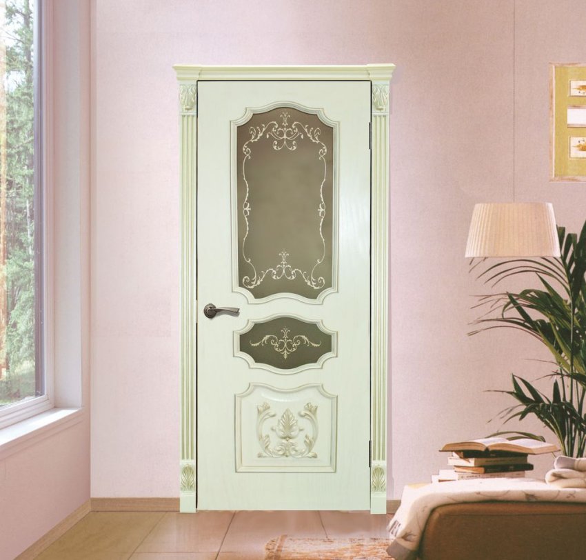 Узорчатая белая дверь с декоративным стеклом может стать входом в комнату маленькой принцессы