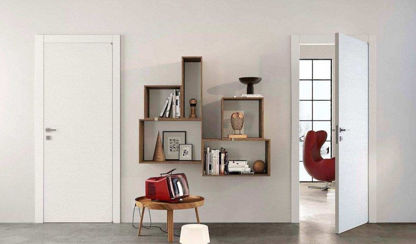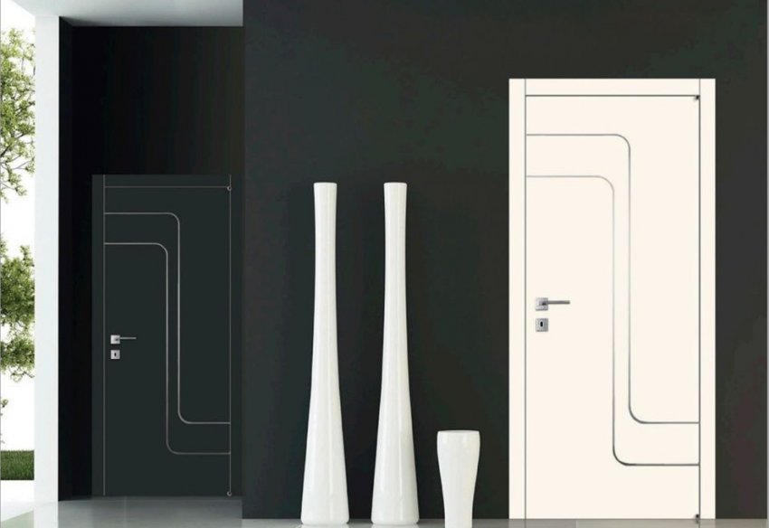 В современном интерьере наиболее уместно смотрятся глухие дверные полотна без филёнок и чётко выраженных перепадов толщины. Их проще всего сделать скрытыми.