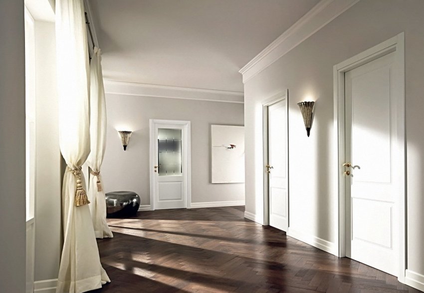 Белые двери со светлыми стенами способны создать отличный фон для контрастного паркетного пола