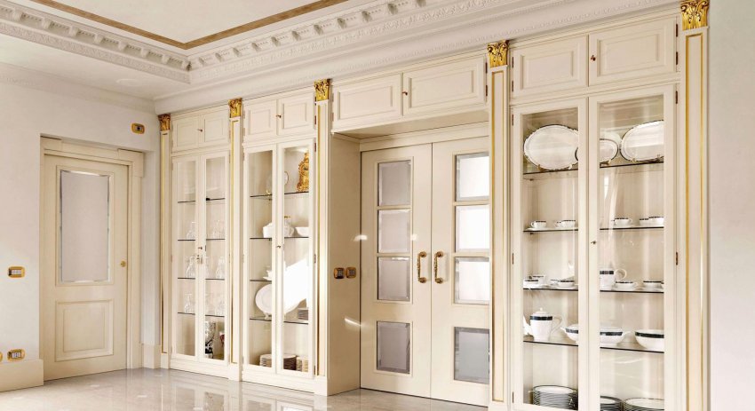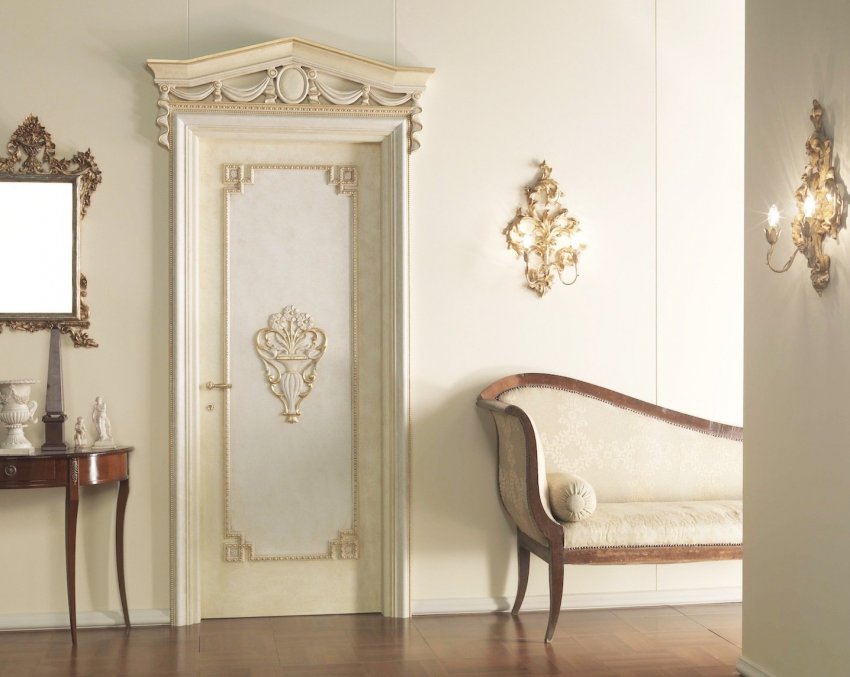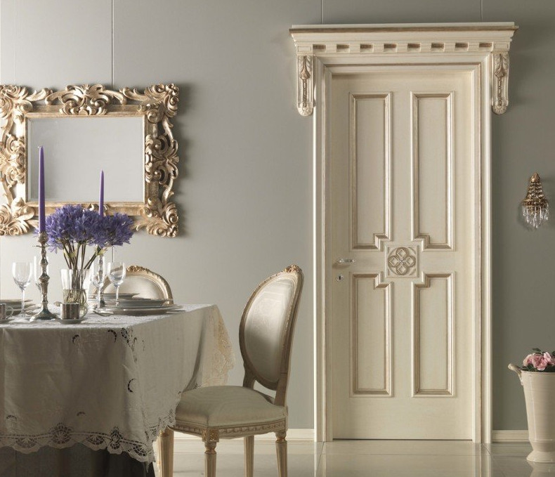 Отличным сочетанием, делающим интерьер роскошным и одновременно сдержанным, является комбинация белых дверей и золотой патины