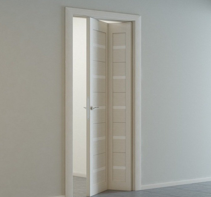 - Складные — гармошки, книжки. В таких моделях дверное полотно способно изменять свои размеры и в открытом состоянии полностью прятаться в дверном проёме. Навешиваются подобные двери на специальные усиленные петли, так как обычные неспособны долго выдерживать увеличенный вес полотен.