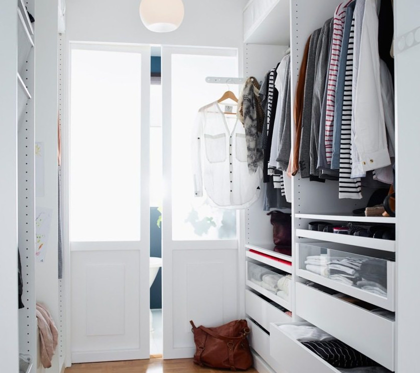 Белые сдвижные двери способны залить гардеробную светом настолько сильно, что отсутствие окна будет незаметно