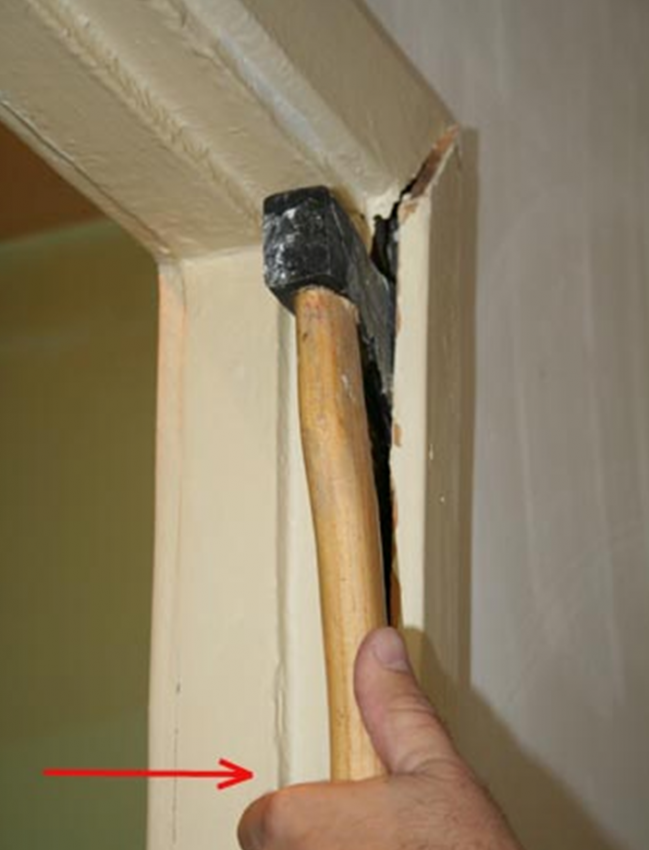 - Отсоединяются элементы декора — наличники и доборы. При этом используют монтировку либо большую отвёртку. Декоративные элементы можно использовать повторно, поэтому не стоит их ломать во время демонтажа. Если эти детали сохранить в целости, их можно покрасить, оклеить ламинированной плёнкой и применить при монтаже новой двери.