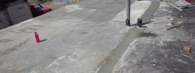 - Пласт из утеплителя накрывают слоем цементно-песчаной смеси, создавая стяжку толщиной 4 см и под уклоном в 4°. Затвердевший пласт бетона обрабатывают праймером или мастикой с полимерами и битумом в составе.