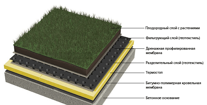 - Зафиксированный гидроизол обрабатывают противогрибковым составом, сушат и покрывают грунтовкой. Поверх гидроизоляционной материи приклеивают утеплитель. Его, в свою очередь, накрывают геотекстилем, дренажной профилированной мембраной и снова геотекстилем. Кровельный «пирог» засыпают плодородной почвой.