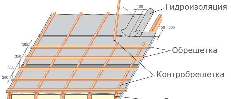 - Одну за другой на обрешётку выкладывают полосы мембраны. При этом делают нахлёсты по 10 см. Между собой куски материи сшивают сваркой.