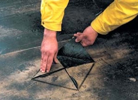 - Из нового рулона рубероида вырезают куски размером с «конверты», вскрытые в слое гидроизоляции. Пустоты в материале обильно промазывают битумной мастикой или расплавленной смолой. Нарезанные заплатки вставляют внутрь раскрытых «писем» и с силой прижимают.
