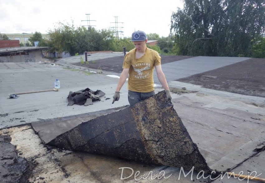 - Вооружившись штроборезкой, в изношенном гидроизоляционном слое толщиной не более 3 см вырезают полосы, которые значительно ускорят демонтаж старого покрытия. От толстого гидроизолятора избавляются кровельным топором. Этим инструментом гидроизоляционное полотно делят на «квадраты» и сдирают с поверхности.