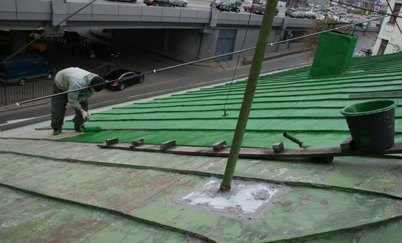 - Удалив с кровли старую смолу и мусор, наносят на неё валиком или макловицей (специальная кисть) новый состав. Если сверху предполагается наклеить лист рубероида, бикроста или чего-то подобного, смолу наносят в 1 слой, если она сама выступает в роли наружного покрытия — в 3 слоя.
