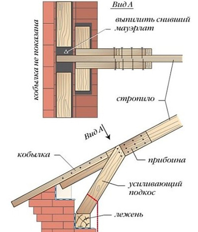 - С двух сторон к стропилу в местах расположения накладок прибиваются подкосы. Подошвой они должны упираться на неповреждённые участки мауэрлата. Если таковые располагаются слишком далеко, нужно для опирания подкосов уложить рядом с мауэрлатом на стену или балки перекрытия брус одного с ним сечения. Брус следует закрепить, подкосы — прибить к стропилу и опоре гвоздями.
