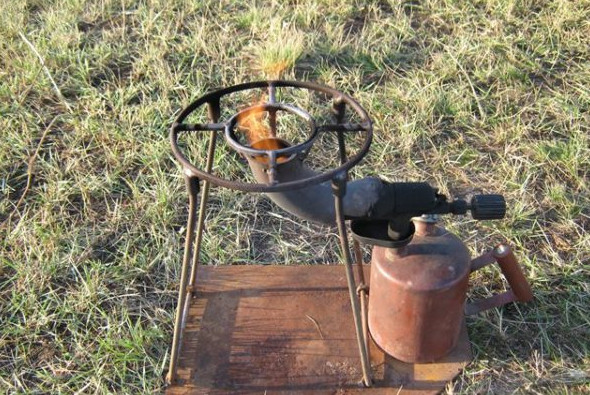 Смола помещается в емкость, установленную на треногу, и разогревается снизу при помощи паяльной лампы