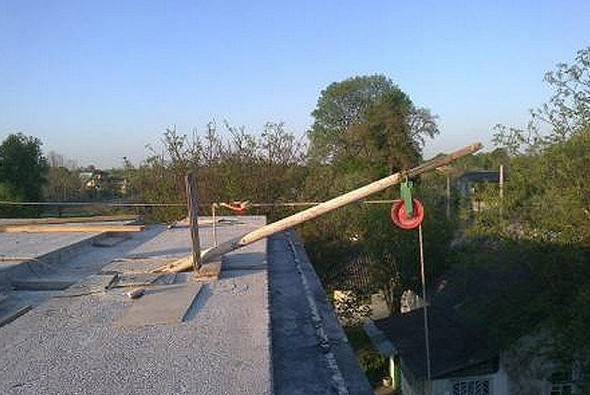 - доска крепится на крыше так, чтобы своим концом с закреплённым на нём блоком она свисала примерно на 1 м;