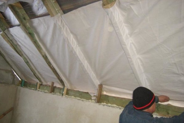 - Застилают теплоизолятор пароизоляционной плёнкой. Здесь также может быть допущена путаница: вместо воздухонепроницаемой плёнки иногда укладывают паропроницаемую мембрану.