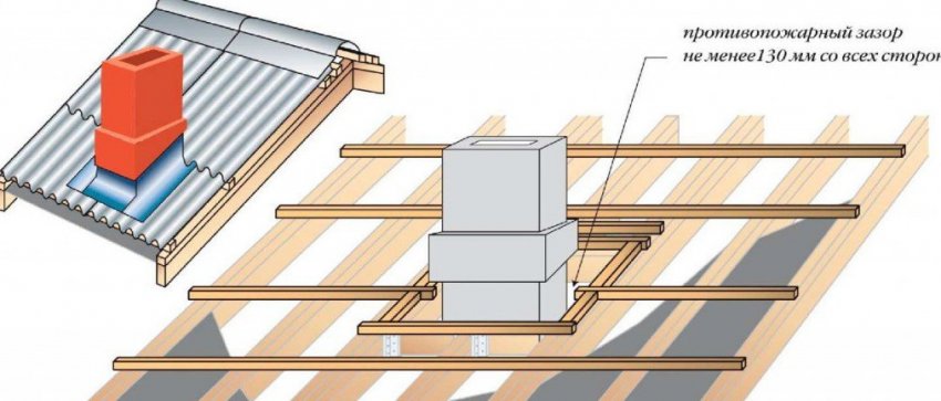 Проход вентиляционных и печных труб через крышу иногда требует смещения стропильных ног с нарушением выбранного шага между ними. Но при наличии труб достаточно больших габаритов, объединённых в один блок, этого бывает недостаточно. Необходимо обрезать стропила в месте прохода труб и соединять отрезанные участки с другими стропилами брусками, закреплёнными на уголки. Расстояние между трубой и деревянными элементами должно соответствовать противопожарному зазору в 130–150 мм.