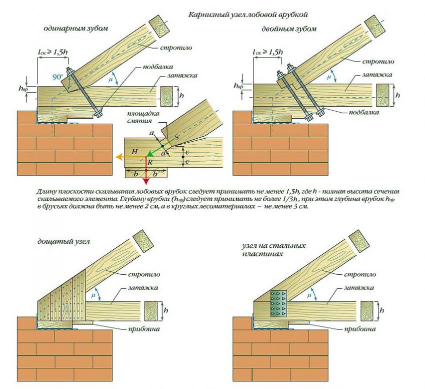 При больших величинах длины и веса стропильных ног и предполагаемой снеговой и ветровой нагрузки соединение необходимо выполнять лобовой врубкой, одинарным или двойным зубом. При этом используются подбалочные подкладки, обеспечивающие плотное прилегание резьбовых шпилек. Перед монтажом необходимо создать шаблоны, которые обеспечат правильный раскрой материалов на узле врубки и безупречное прилегание элементов. Чтобы избежать сколов на краях балки перекрытия, необходимо производить врубку на глубину не менее 2 см и на расстоянии 1,5 h от края балки (где h − высота балки).