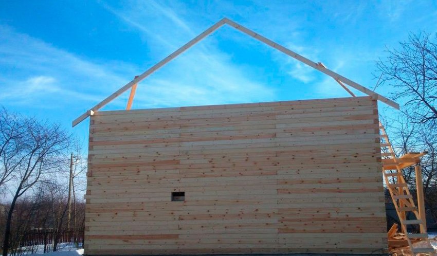 - Первая заготовка под стропильную ферму устанавливается с одного края крыши (на фронтоне). На стропильных ногах делается врезка, и они крепятся к мауэрлату, балкам перекрытия и коньковому прогону.