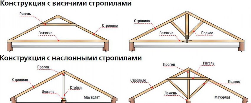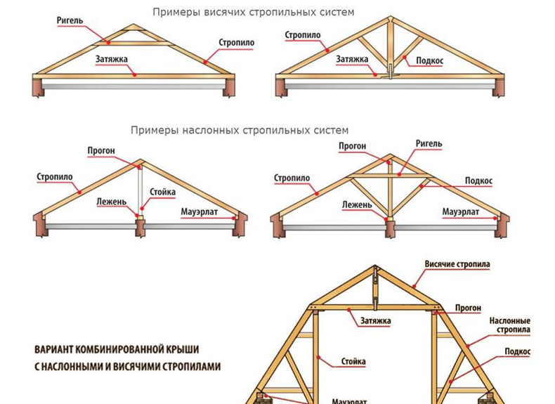 В зависимости от типа и размеров крыши стропильные системы бывают наслонными, висячими или комбинированными, но их основные элементы во многом повторяются