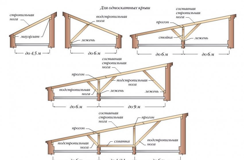 Выбор конструкции односкатной стропильной системы зависит от длины ската, при этом допускается использование составных балок