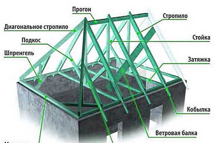 Четырёхскатные крыши образуются двумя трапециевидными и двумя треугольными скатами и имеют сложную конструкцию стропильной системы с опорным каркасом, на который монтируются рядовые и диагональные балки. Пространство между стропильными лагами заполняется нарожниками, а дополнительной опорой для диагональных ног служат шпренгели, опирающиеся на угловые перемычки.