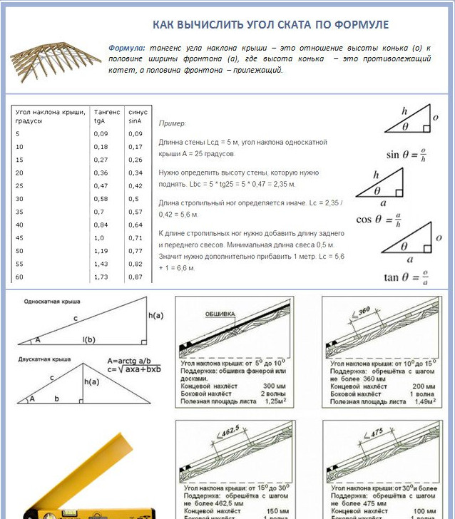 - Определяется угол наклона крыши.![]() Угол наклона вычисляется по тригонометрическим формулам