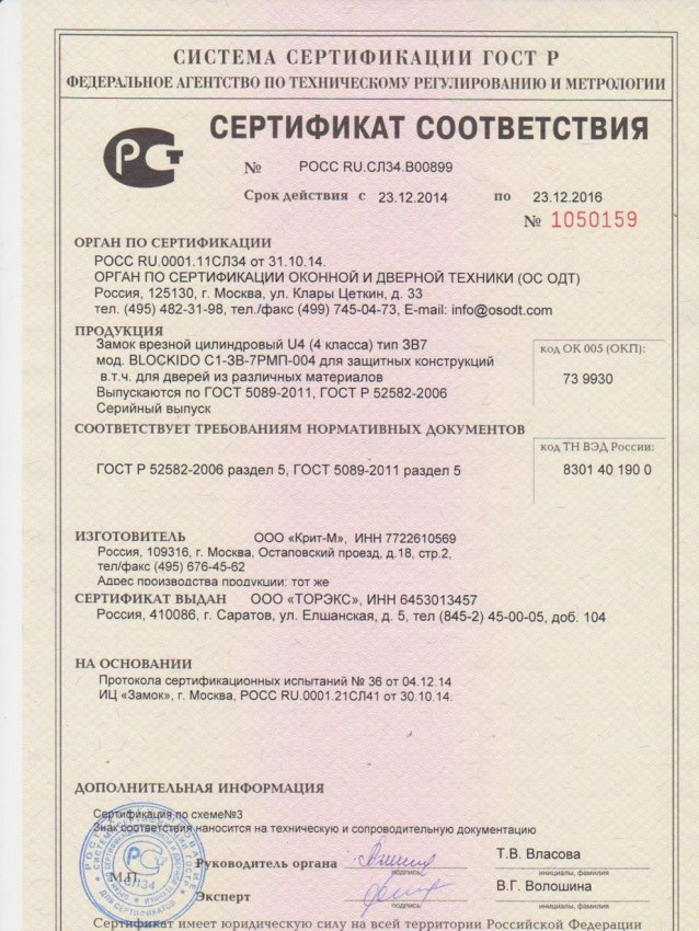 Сертификат соответствия подтверждает заявленные характеристики замка для входной двери