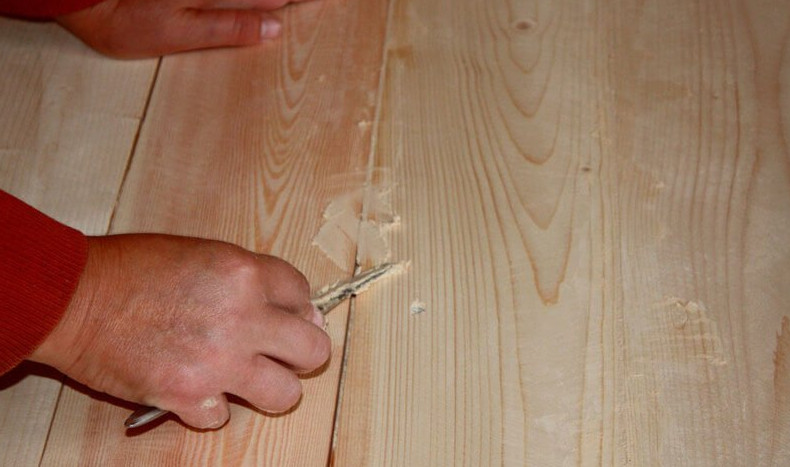 - Сколы и трещины на полотне двери. Первые устраняются наклеиванием в месте повреждения накладки из древесины того же сорта. Если не удаётся подобрать материал такого же цвета, нужно воспользоваться морилкой. Перед установкой накладки повреждение подрезается ножом до получения плоской базовой поверхности, после чего устанавливается недостающий элемент. Хороший результат обеспечивается при использовании клея «ПВА-М». Время его сушки составляет 2–4 часа, после чего можно продолжать работу. Наклеенному фрагменту придаётся форма первоначального узора. Трещины в деталях можно устранить шпаклёвкой, приготовленной самостоятельно. Для этого используются мелкие опилки той же породы древесины, подобранной по цвету. Нужное количество смешивается с клеем «ПВА-М» до консистенции густой сметаны. Этот клей при высыхании становится прозрачным. Перед нанесением шпаклёвки трещину нужно разделать и продуть струёй воздуха от пылесоса. Сушка производится в течение суток, после чего обработанные участки зачищаются мелкой шкуркой.