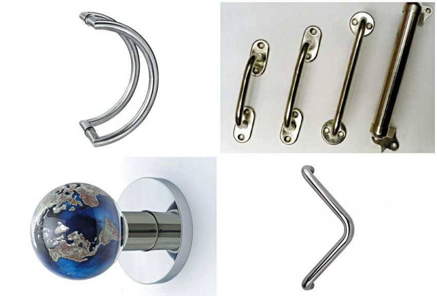 Помимо петель для полноценной эксплуатации двери требуется ручка. Такой элемент может быть стационарным или нажимным. Ручки первого вида представляют собой скобу или деталь иной формы, которая просто прикручивается к полотну в нужном месте.