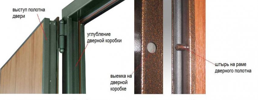 Большинство качественных современных моделей дверей из металла имеют противосъёмные и защитные элементы. Снаружи всегда находится металлическая облицовка, а со стороны помещения дверь оформлена панелью из МДФ или металла. Короб при этом состоит из профильных элементов, соединённых вместе, а снаружи помещения устанавливаются наличники, выполняющие декоративную функцию.