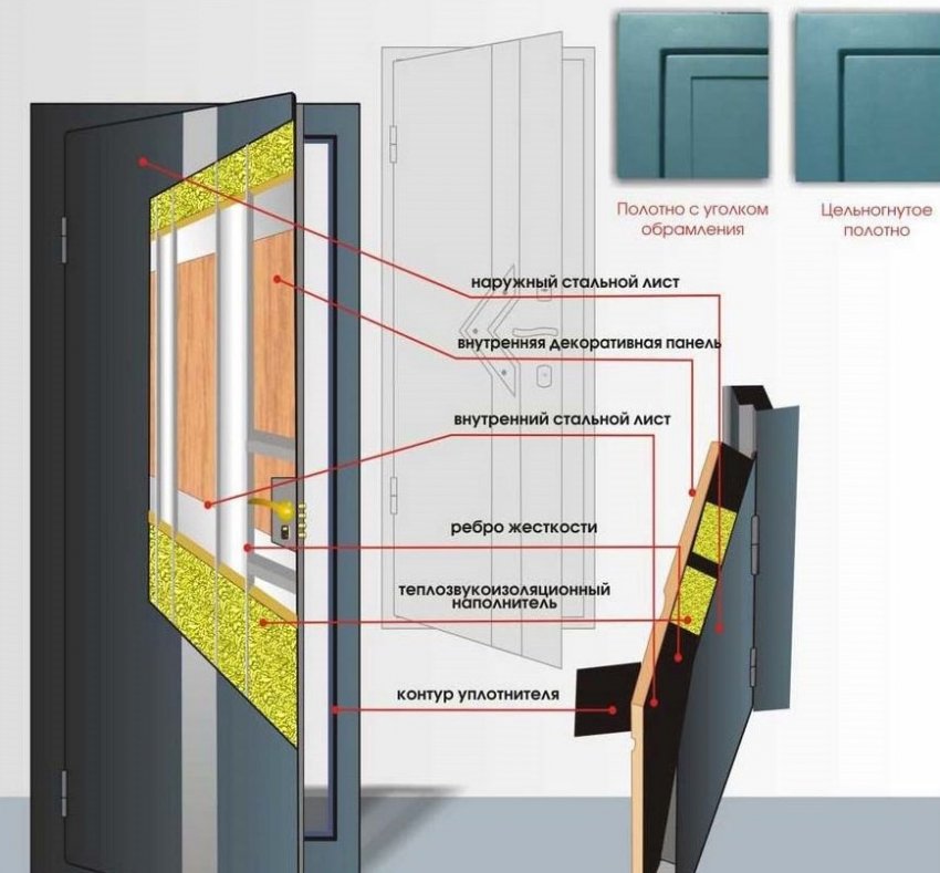 Внутри полотно имеет рёбра жёсткости, между которыми располагается тепло- и звукоизоляционный материал. Со стороны помещения дверь оснащена декоративной панелью. Таким образом, качественные металлические полотна являются многослойными и обеспечивают хорошую защиту помещения от шума и холода.