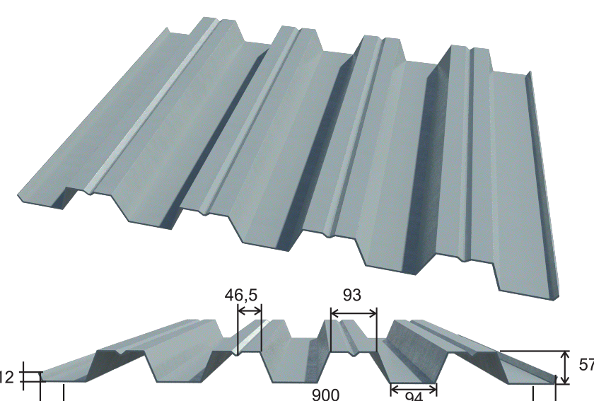 - Н57 — высота волны 57 мм, рабочая ширина профлиста 750 мм, толщина стали 0,6–0,9 мм. Шаг гофры составляет 187,5 мм, а вес 1 м2 материала толщиной 0,8 мм равен 9,19 кг. Нижняя часть волны дополнена ребром жёсткости. Марка применяется для пологих крыш или в регионах с большим количеством осадков;