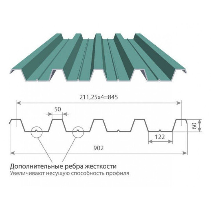 - Н60 — высота волны 60 мм. Профлист производится из стального проката шириной 1250 мм, а после формирования приобретает ширину 902 мм. В нижней части есть ребро жёсткости. При изготовлении оцинкованный материал покрывается полимерным цветным компонентом;