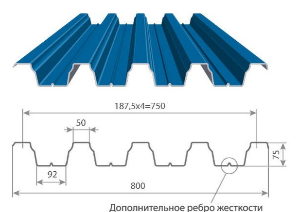 - Н75 — высота волны 75 мм, толщина стали 0,65–1 мм, длина листов 0,5–14,5 м, рабочая ширина 750 мм. Шаг трапеции равен 187,5 мм, а вес 1 м2 толщиной 1 мм составляет 12,87 кг. Гофра имеет сложную форму и рёбра жёсткости в нижней части, что делает материал максимально прочным и стойким к механическим нагрузкам;