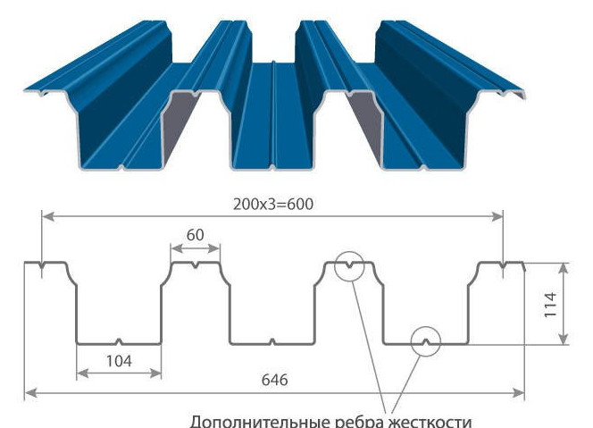- Н114–600 — общая ширина 646 мм, рабочая ширина 600 мм, толщина стали 0,8–1 мм. Длина листа от 0,5 до 13 м, шаг трапеции 200 мм, рёбра жёсткости на всех частях гофры. Полимерное покрытие.