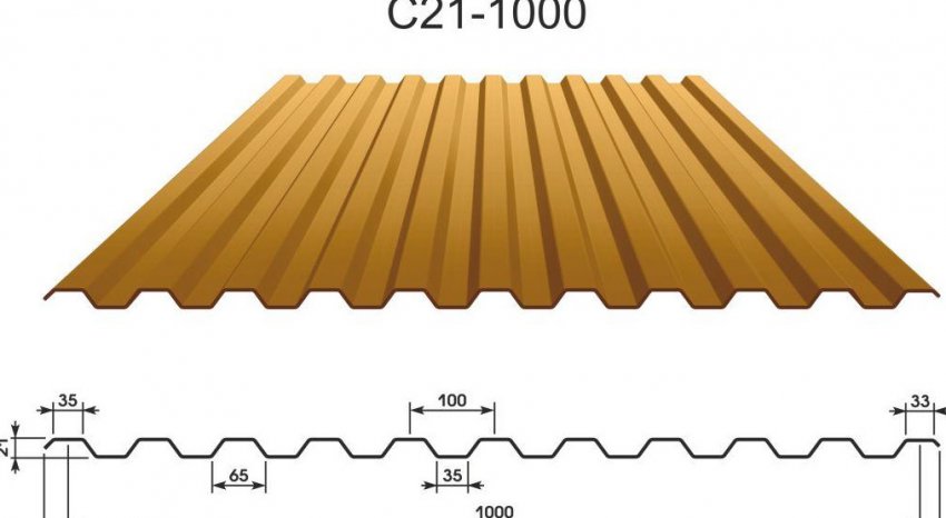 - С21 — высота волны 21 мм, ширина профлиста 1051 мм, рабочая ширина 1000 мм. Толщина листов: 0,35 мм или 0,7 мм, или 0,8 мм. Капиллярная канавка на профиле отсутствует. Материал хорош для крыши со скатами более 45°. Полимерное покрытие защищает металл от коррозии и ультрафиолета;