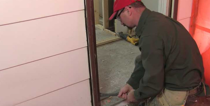 - Демонтаж старой двери вместе с коробом, если он сильно деформирован, расколот и т. п.![]() Необходимо удалить старую дверь вместе с коробкой, а затем выровнять входной проём